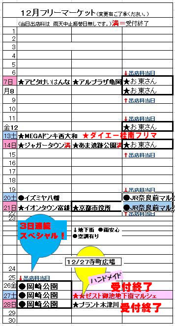 | 12/21(日)予定の フリーマーケット 悪天候の為全て中止 出店者様へ ★イオンタウン富雄南フリマ 中止振替日1/18(日) ★京都市役所フリマ 振替日無し 次回1/18(日)募集中 ↑新たにお申し込みください。 ★奈良駅前マルシェ 振替日無し 次回1/17(土)18(日)募集中 ↑新たにお申し込みください。 ※18日は 手作り商品 ------------------------------------------------ 12/14日 本日は、キャンセルokとさせていただきます。 ★あま遺跡公園振替日3/29日 ★ジャガーフリマ振替日1/11日 ★お東さん振替日無し お願い プラント木津川フリマ ●警備体制の関係上 搬入時間 8時から 9時30分 (時間厳守) 早朝(7時台等)のご来場はご遠慮ください。 ●喫煙は指定の場所でのみ可能です。 フリマ会場内禁煙 です。 フリーマーケットの継続のために、 皆様のご協力をお願い申し上げます。 |